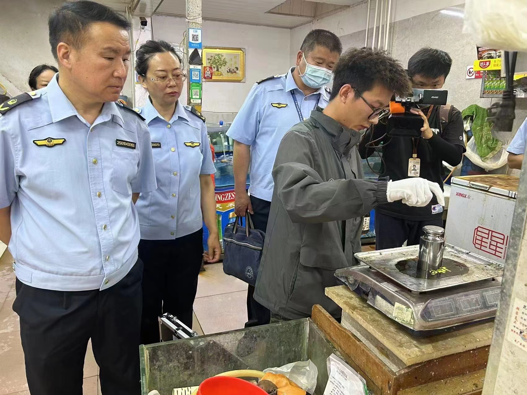 近日,昆明市西山区市场监督管理局联合中检西南计量有限公司对和平农贸粮油海鲜综合市场进行突击检查,重点检查市场内海鲜经营户的计量器具。